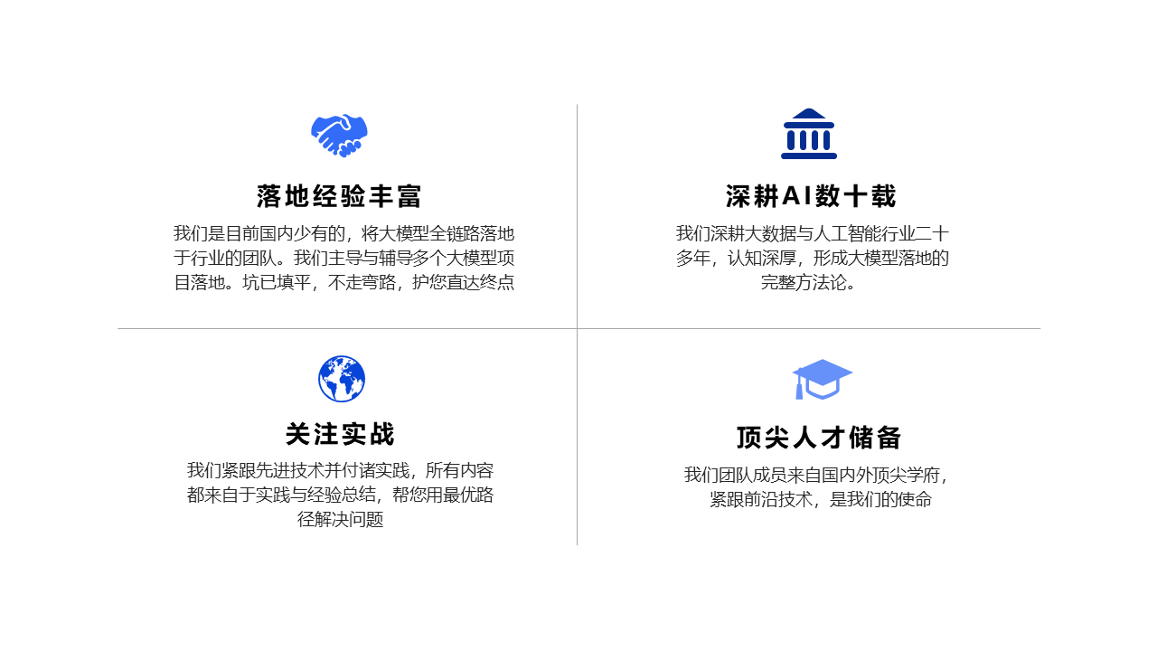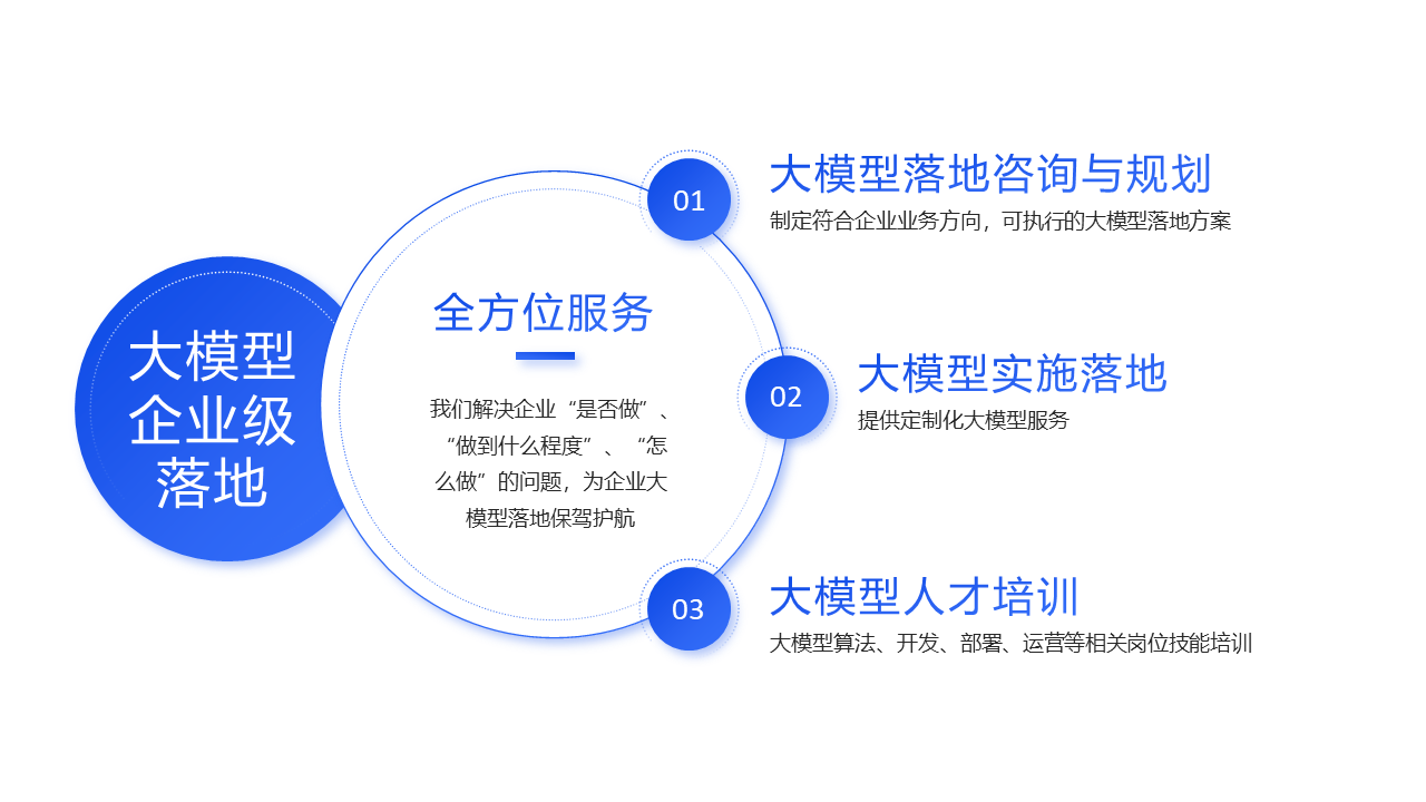 专属大模型定制化训练,应用场景更贴合 私有化大模型部署,数据更安全 大模型高阶人员培养,企业更可控